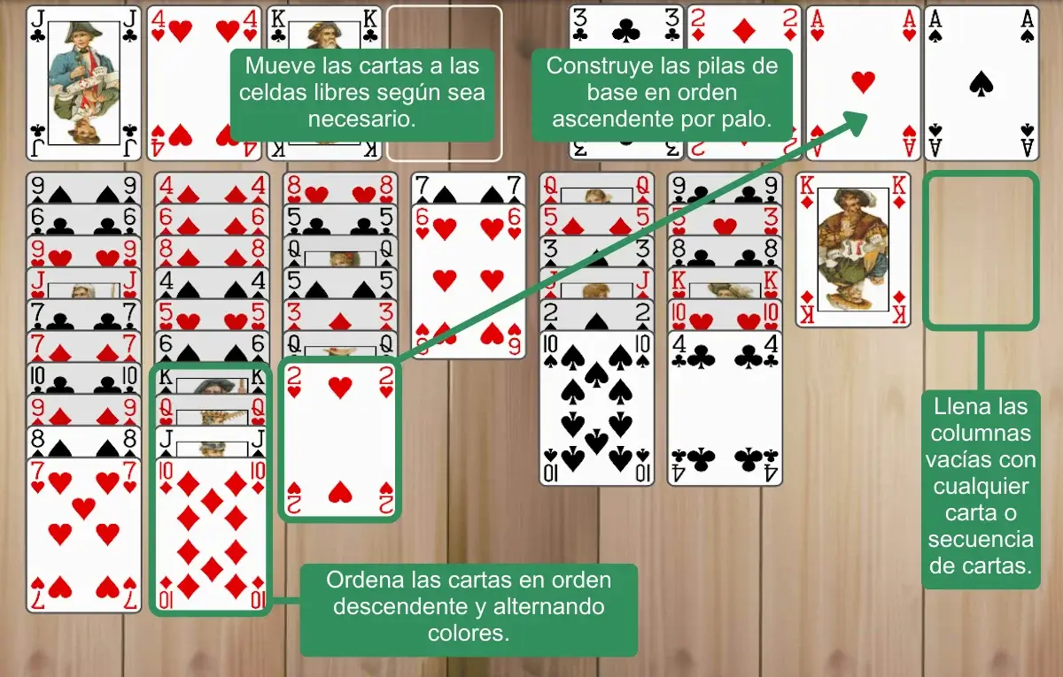 boca arriba, tienen casillas libres y el objetivo es mover las cartas a las pilas de base en orden ascendente